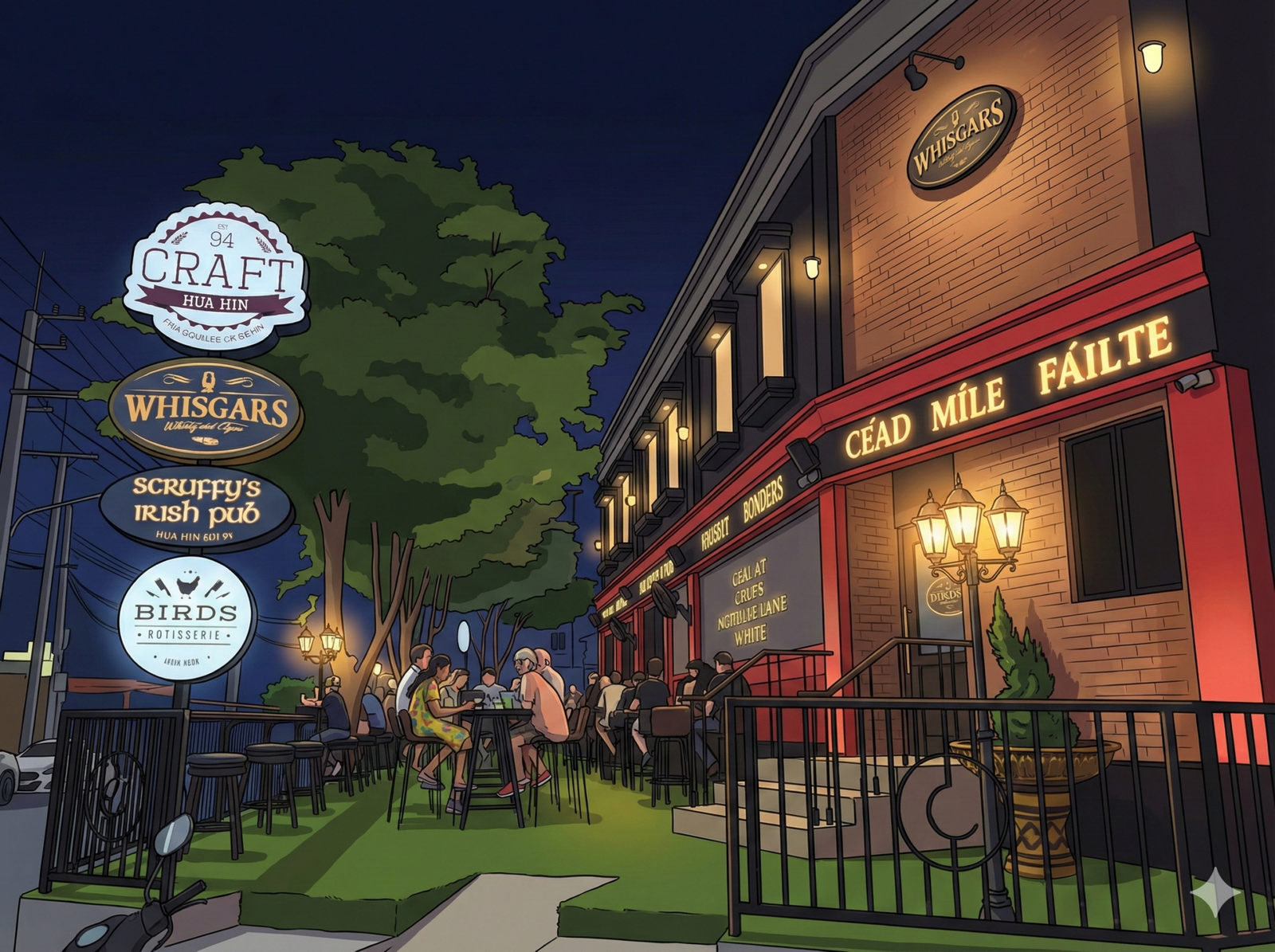 Think of it as the “Thonglor” of Hua Hin, but with a relaxed, open-air vibe. It is packed with Japanese Izakayas, craft beer gardens, legendary burger joints, and a massive live music compound.